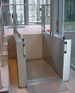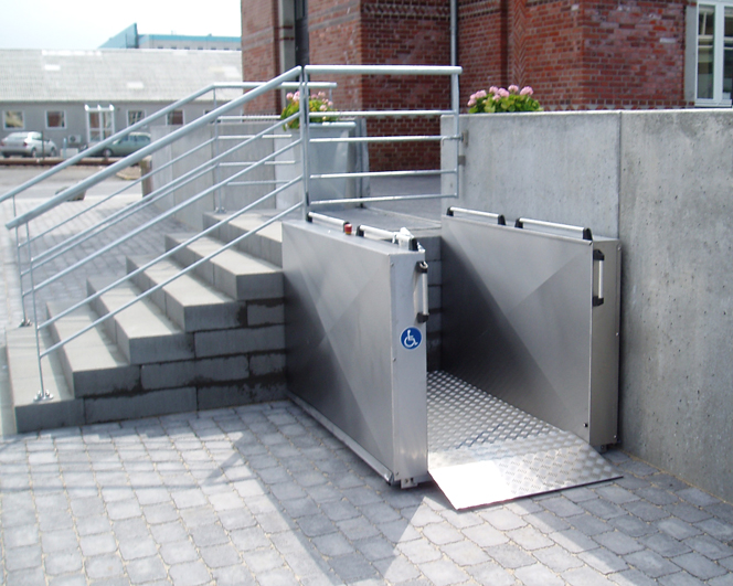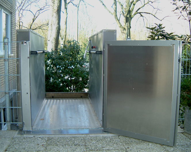 Hebelift mit einer Hubhöhe bis 1,3 Meter Hublift für den Innen- und Außenbereich in zwei Variationen lieferbar mit einer Hubhöhe bis 1 Meter oder 1,3 Meter. Der Hebelift zeichnet sich durch seine Bedienerfreundlichkeit, seine robuste Konstruktion und durch das umfangreiche Zubehör aus. Ausstattung Das Bedienelement ist als Handbedieneinheit am flexiblen Spiralkabel oder als feste Bediensteuerung, zentral an der Bordwand des Hebeliftes angeordnet. Stabile Handgeländer an den Seitenwänden erweisen sich in der praktischen Nutzung als sehr komfortabel. Für den Hebelift ist eine Tür als Absturzsicherung an der oberen Haltestelle lieferbar. Produktfremde Türen können über eine elektromechanische Verschlußeinheit in den Sicherheitskreis eingebunden werden. Als zusätzliche Ausstattungsvariante ist ein preiswerter Bügel als Absturzsicherung lieferbar. Das Hauptmerkmal ist die niedrige Auffahrhöhe auf die Plattform von nur 5 bzw. 7 cm, der Lift benötigt somit keine kostspielige Grube mit Entwässerung. Für den Einsatz der Hebebühne sind keine baulichen Veränderungen notwendig, bis auf einen stabilen Untergrund und einen 230 Volt Anschluß. Die Auffahrrampe auf den Hebelift fungiert gleichzeitig als Abrollsicherung. Die in den Seitenwänden integrierte, elektromechanische Hebetechnik, zeichnet sich durch ein sanftes, geräuscharmes Fahrverhalten aus. Hebelift bis 1,3 Meter Hubhöhe Der Hebelift ist in zwei Größen lieferbar: